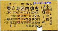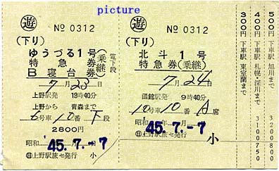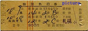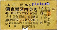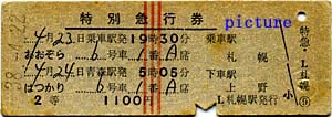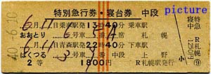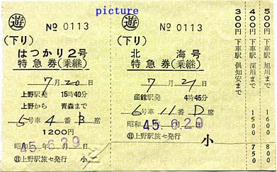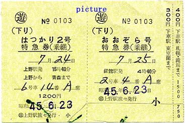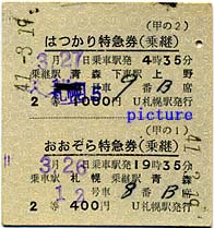 左の券は後年手に入れたものですが、日本海経由で北海道に行く切符です。新津から特急白鳥、函館でおおぞらに乗り継いで札幌まで行きます。 右の券も後年手に入れたものですが、上野からはつかり、おおぞらを乗り継いで旭川に向かう本州→北海道の券です。 |