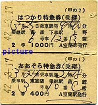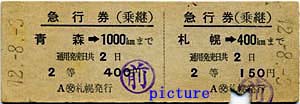 左の2枚の特急券は切符の性格は上記と同じですが、切符の様式が違いC型券です。A型券を上下に2つつなげたものと同じサイズです。上下にそれぞれの列車に対応した特急券で下部(甲の1)が乗車駅から道内の特急券で上部(甲の2)が乗継駅青森から終着駅上野までの特急券です。切り離せるようになっているため両方残っているのが難しい券です。 |