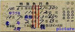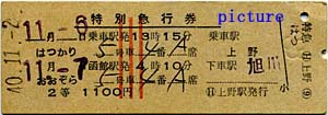 この券は上記の券とちょっと違って、上記の券が特定の切符として列車名や乗車時刻、駅名などがあらかじめ印刷されている常備特急券に対して、列車名や下車駅を旅客の要望に応じて切符をつくってゆくもので、準常備特急券と言います。着駅に応じて特急料金が変わるのに対応して券の右側をはさみで切り取ります。 |